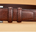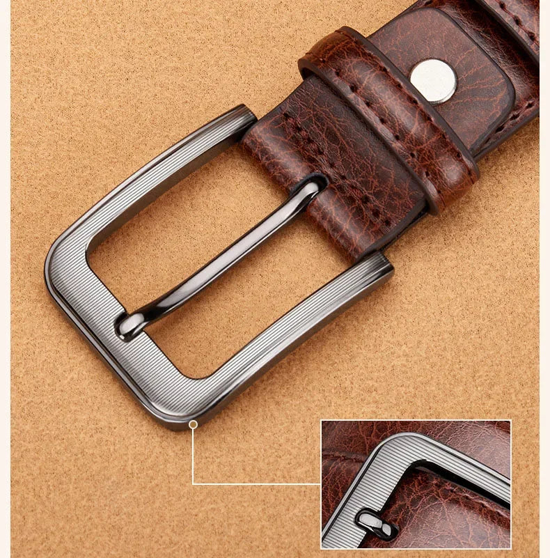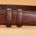 Featuring a refined alloy pin buckle (2.17″ × 1.57″ / 5.5 cm × 4 cm), this design offers a balanced profile that’s neither too bold nor too understated. The buckle’s sleek metallic finish complements the vintage character of the strap, making it a versatile match for jeans, chinos, and dress pants.
